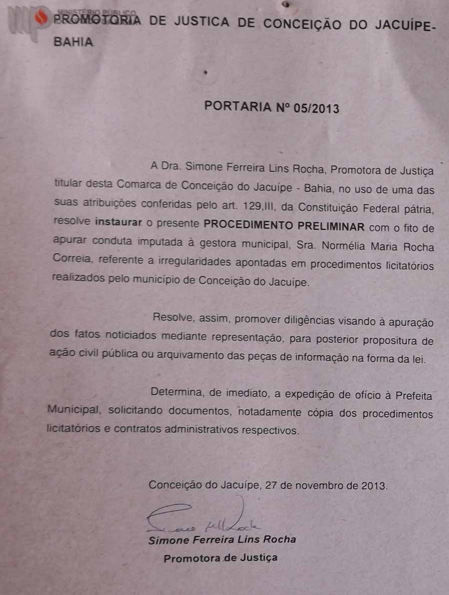 (Berimbau) abriu um novo Procedimento Preliminar contra a prefeitura