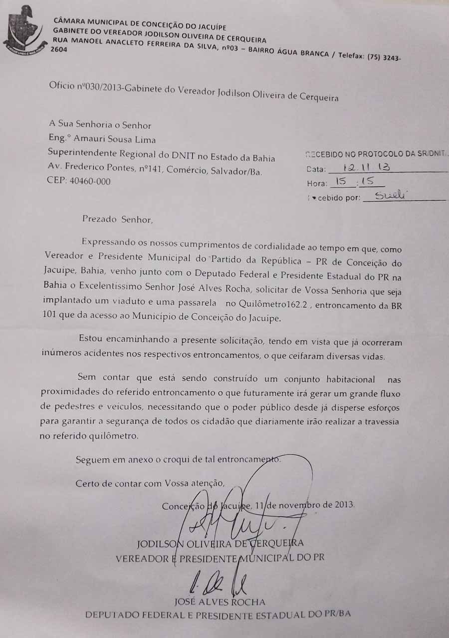 Esta tragédia é mais uma das varia acontecidas neste local. Atualmente o Vereador de Conceição do Jacuípe, Sr. Jodilson Cerqueira tem feito certas ações para que essas fatalidades não aconteçam mais. Abaixo esta a copia de um documento enviado ao DNIT pedindo uma passarela no local.