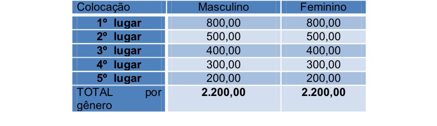 Os atletas classificados do 1º ao 5º Lugares na Categoria geral Masculino e Feminino vão receber uma medalha e uma bonificação de incentivo por objetivo atingido conforme tabela abaixo: