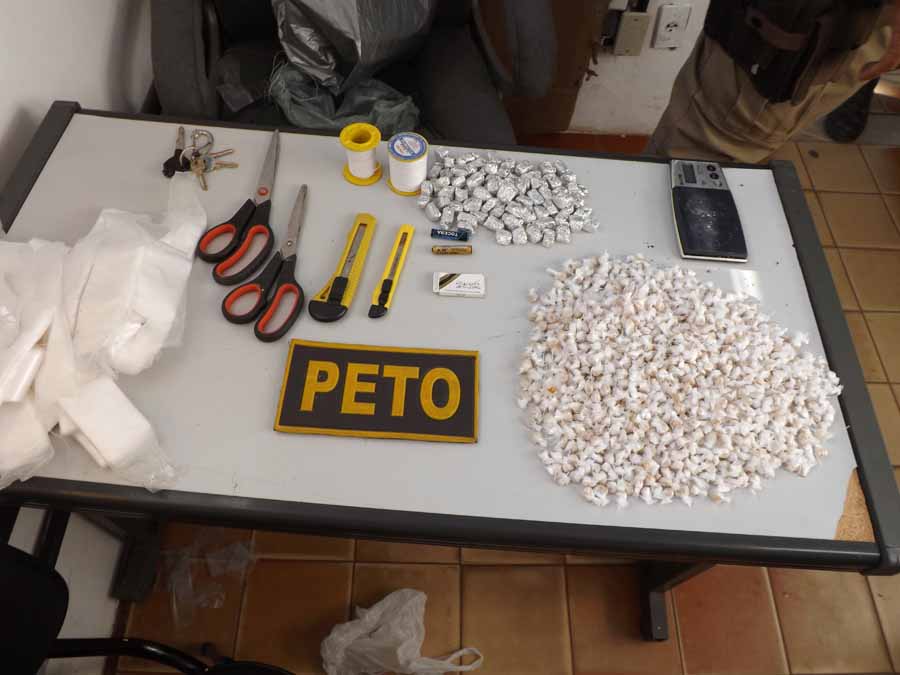 Juntamente com Michele foi apreendida 80 buchas de maconha; 810 pedras de crack e mais material para embalagem das drogas: estiletes, laminas e tesouras. Ela informou que a droga não era dela e sim de outra pessoa por nome Pinha.