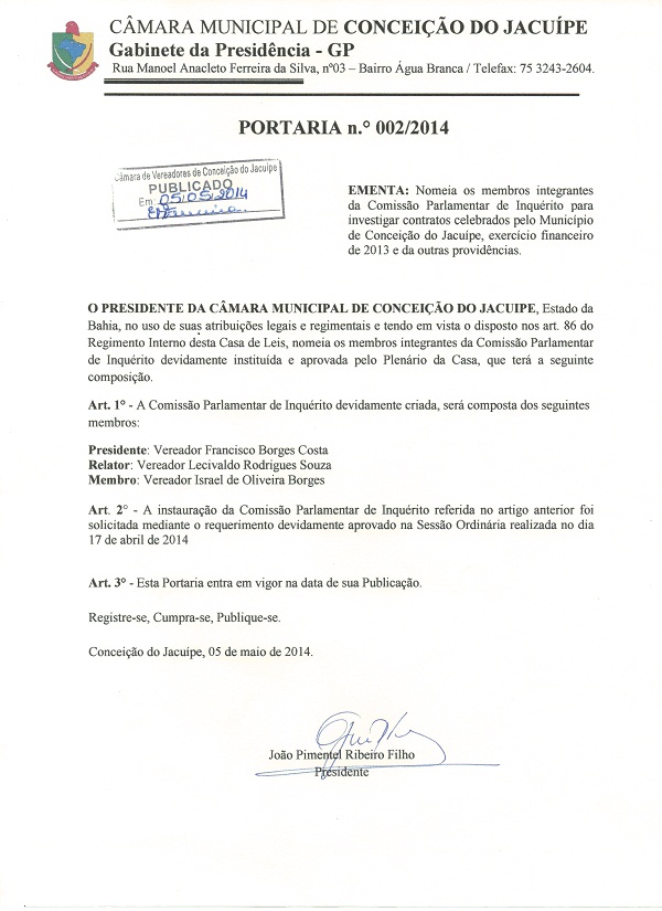 Câmara Municipal de Conceição do Jacuípe, nomeou os membros que fazem parte da Comissão Parlamentar de Inquérito (CPI)que investigará os contratos celebrados pelo Município no exercício financeiro de 2013.