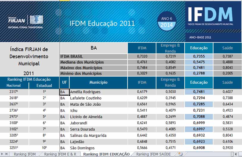 O avanço nas duas vertentes fez com que o país atingisse 0,7320 ponto no índice, um crescimento de 1,8% na comparação com 2010.Dentro deste índice a região do Portal do Sertão – BA, teve um grande destaque na educação com Amélia Rodrigues, notabilizada como a 1ª no ranking da Bahia (melhor educação da Bahia no índice FIRJAN).
